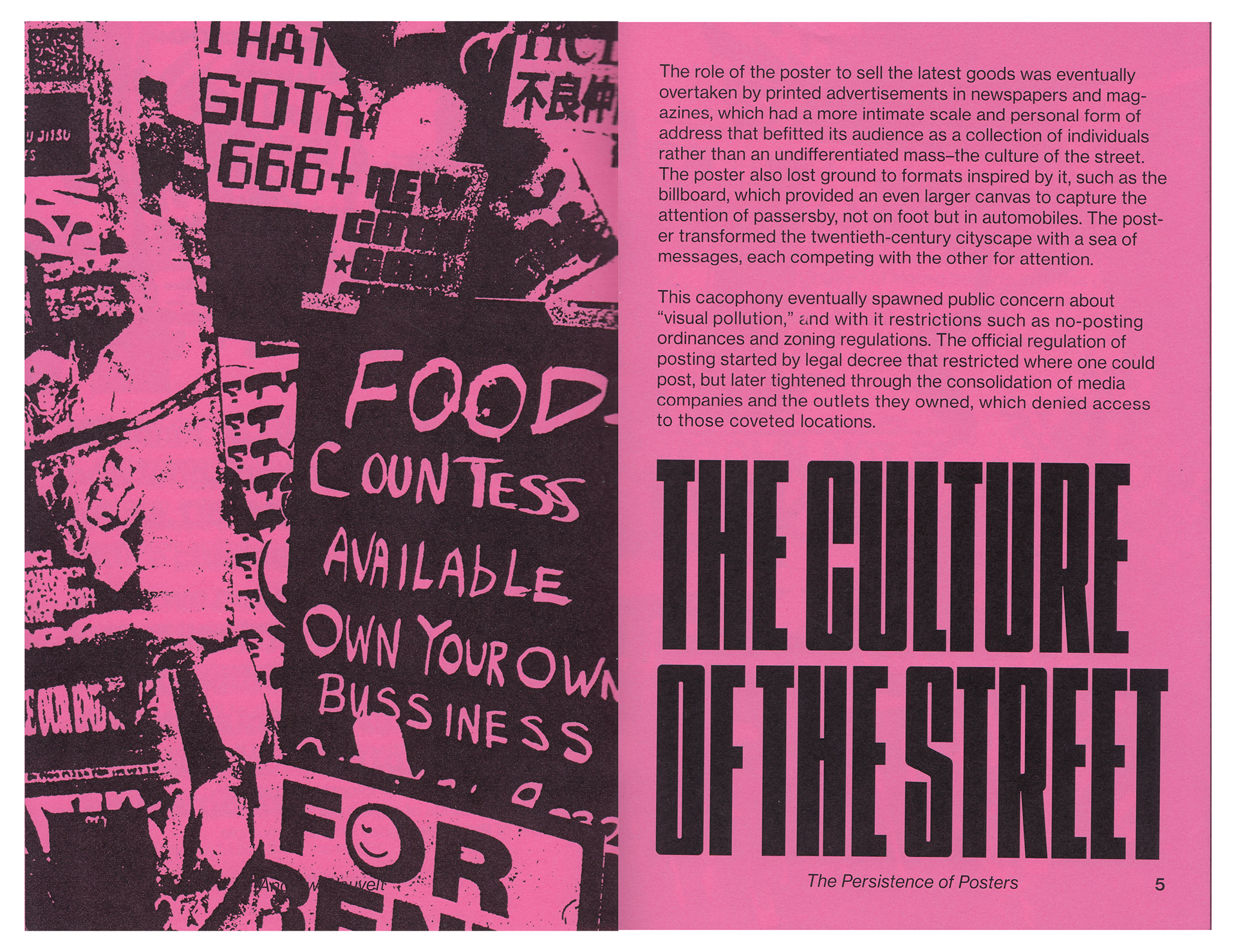 I took a word-heavy essay like Andrew Blauvelt’s “The Persistence of Posters” and repackaged it into a compact zine that would engage curious readers without intimidating them with walls of text.